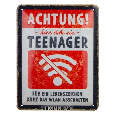Nostalgic Art Attention Teenager WLAN Warning Sign as a Gift idea, Made of metal, Vintage Design with Saying, 15 x 20 cm