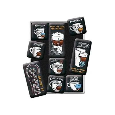 Coffee gift: for coffee lovers, particularly high-quality and colourful print in 1A quality We love retro: 9 different magnets in nostalgic design sealed with epoxy resin in two different sizes: small (2.2 x 2.2 cm) and large (4.5 x 2.2 cm) Practical and colourful: strong magnets for order on the fridge, magnetic board or magnetic pin board, easily hold postcards, memories or pizza flyers, not suitable for glass boards Cool eye-catcher and great gift: decorative fridge magnets with a pleasant feel in a transparent gift box in the format 7 x 9.3 x 2 cm Quality product: high-quality workmanship, designed in Berlin