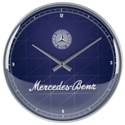 MERCEDES-BENZ GIFT: for Mercedes-Benz drivers, high-quality and colorful printing in 1A quality WE LOVE RETRO: nostalgic design wall clock with dial matching pattern, pleasantly large and quiet Great and decorative: round analog clock with a diameter of 31 cm and a depth of 5.5 cm, to decorate the kitchen, living room, garage and workshop Great gift: robust wall clock with discreet metal frame, domed real glass front and battery-operated quartz movement OFFICIAL LICENSE PARTNER: Original licensed product, "Designed in Berlin"