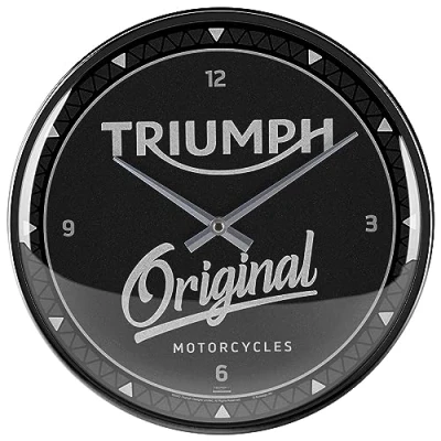 TRIUMPH GIFT: for motorcycle lovers, high-quality and colourful print in quality 1A WE LOVE RETRO: nostalgic design wall clock with dial matching pattern, pleasantly large and quiet Great and decorative: round analog clock with a diameter of 31 cm and a depth of 5.5 cm, to decorate the kitchen, living room, garage and workshop Great gift: robust wall clock with discreet metal frame, domed real glass front and battery-operated quartz movement OFFICIAL LICENSE PARTNER: Original licensed product, "Designed in Berlin"