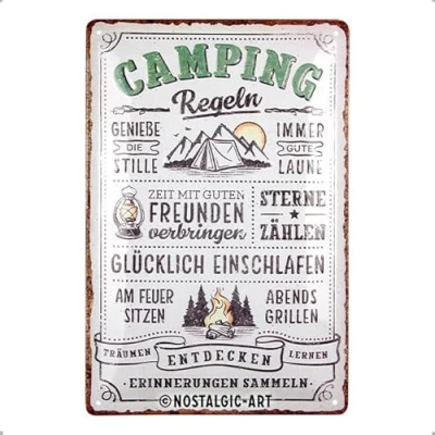 Camping gift: for camping lovers, particularly high-quality and colourful print in 1A quality We love retro: tin sign in a nostalgic design made of extra strong sheet steel as a great decoration for the kitchen, living room or in your own bar Practical and colourful: robust metal sign in DIN A4 format with plastic curvature, motif embossing and pre-drilled holes for easy attachment with nails on the wall Cool eye-catcher and great gift: beautiful alternative to paper posters, for great retro flair at home, "Designed in Berlin" Made in Germany: high-quality workmanship, made in Germany