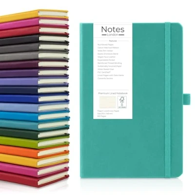 Features - Medium A5 Notebook (14 x 21cm) with a luxury thermal PU hard cover notebook. This journal has traditional 70gsm ivory lined pages ( 160 pages / 80 sheets ) with numbered pages and date mark spaces in the top right hand corner of each page. This notepad comes with a handy pen loop holder, elastic closure, ribbon page marker, expandable paper pocket in the back and a contents page Notebook Colours Available - Black, Navy, Blue, Red, Green, Light Grey, Dark Grey, Teal, Cyan, Purple, Burgundy, Pink, Yellow, Lime, Pastel Purple and Pastel Blue Designed in the UK our notebooks are a great multipurpose pad which can be used for office work / work / business / university / college / school / education / notes / note taking / diary / shopping list / recipe book / exercise / gym / fitness / workout / personal training / accounts / nurse notes / astrology & manifesting notes etc. Our notebooks are perfect for personal use or an amazing gift for a loved one