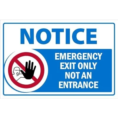 Notice, Emergency exit only, Not an entrance, safety sign. Self adhesive sticker. Printed using the latest digital technology and laminated for extra durability. Remove backing film and apply to dry, smooth, oil free surface. All signs come with a 5-year warranty.