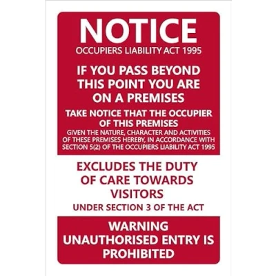 Notice occupiers liability act 1995 warning unauthorised entry is prohibited prohibition sign. 3mm Aluminium sign. Digitally printed and laminated for extra durability. 10mm Radius rounded corners, no sharp edges. All signs come with a 5-year warranty. All our signs are UV resistant meaning they will not fade in sunlight. Suitable for indoor & outdoor use.