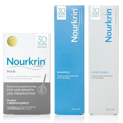 3 month supply Value Set containing FREE Shampoo and Conditioner Nourkrin MAN is an all-natural, drug-free Hair Prevention Programme for Men The treatment is designed to reduce and prevent hair loss by supporting the existing, normal hair growth. To be used over a 6 month period 180 tablet box.
