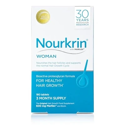 Natural and drug-free, Nourkrin Woman tablets are scientifically formulated to support and maintain normal hair growth, especially during times of disruption, and are suitable for all hair types, including fragile and delicate hair. Nourkrin’s bioactive proteoglycan formula nourishes the hair follicle and supports the body’s own natural hair growth mechanism, the Hair Growth Cycle, helping to support the overall life and function of the follicle and hair. Contains proprietary ingredient Marilex, which is rich in specific proteoglycans – biological molecules found extensively throughout the human body, which govern certain biological processes including the Hair Growth Cycle. Supported by more than 30 years research into hair growth disorders, including over 100 scientific and clinical publications. Nourkrin is the only proteoglycan therapy product for hair growth and is recommended by dermatologists and trichologists the world over. Daily intake provides 600mg Marilex, 60mg silica and 180mcg biotin in 2 easy to swallow tablets.