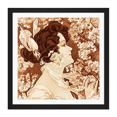 Nouveau Woman Flowering Tree Painting Square Wooden Framed Wall Art Print Picture 16X16 Inch