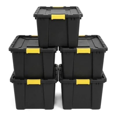 NOVECRAFTO 100L Large Storage Box with Lid, 5 Pack Heavy Duty Carry Handles, Durable Plastic, Clip Locks, Padlockable & Stackable Garage, Shed Outdoor Use (Black)