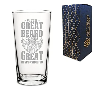 Novelty Engraved/Printed Conical Beer Cider Pint Glass with Great Beard Comes Responsibility Engraved Message