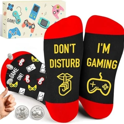 FUN GIFT: Are you still struggling to find a fun gift idea to surprise the gaming lover in your life? these game socks are a great choice that will make your recipient squeal with delight. Game socks are perfect for teenage boys, sons, husbands, boyfriends, nephews, men, dads, kids, adults, men, women and more. Disengage the "Do Not Disturb" socks without being disturbed during play. FUNNY SOCK DESIGNS: We've added fun patterns and text "DO NOT DISTURB, I‘M GAMING" to our novelty socks. All the words and patterns are perfectly integrated with the socks to ensure that they won't come off, the non-slip sole rubber makes it safer for you to walk, you can wear them to work, play games, go on a date, go to a party or just stay at home - these funny socks will increase your sense of humour and attraction QUALITY MATERIALS: The fun socks are made of luxurious cotton that does a good job of keeping your feet soft, comfortable, warm and dry, but not making them hot and sweaty. Designed with a fun knit word poly that has a non-slip effect but won't make your feet feel uncomfortable, they provide good support and softness for your feet whether you are walking, jogging or exercising, etc. Suitable for slippers, sandals, casual shoes, sports shoes, formal shoes or formal shoes. ONE SIZE FITS BEST: Unisex UK 2-7/EU 35-42. with great stretch for all seasons and equally good for most feet, these stylish socks will withstand years of wear and washing and stay colourful, comfortable and well-fitting! GIFTS IDEA FOR ANY OCCASION: Gamer socks are great gift ideas for teenage boys, men, husband, kids, tween boys, son, with funny saying "Do Not Disturb, I'm Gaming". Novelty socks are perfect gift for all occasions, like fathers day, valentines day, Birthdays, Mother's Day, Thanksgiving Day, Christmas, parties,Santa gifts. if you have any questions or are not satisfied, please feel free to contact us and we will be happy to help you!