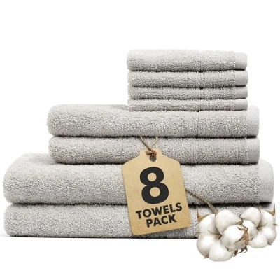 Novo Home Bath Towels Set of 8 100% Cotton Light GreyTowel Bale Includes 2 Bath, Hand, 4 Face Soft, Absorbent & Quick Dry Towel for Bathroom, Spa, Kitchen, Hotel Use