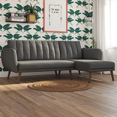 Modern design in stylish linen upholstery with ribbed tufted cushioned back. Multi-functional piece ideal for small living spaces: converts seamlessly from a sofa into a bed. The chaise can be set up in either side of the sofa. Made with a sturdy wooden frame, it is easy to assemble. Available in Blue Linen, Grey Linen and Green Linen. Ships in two separate boxes and wipes clean with a damp cloth.