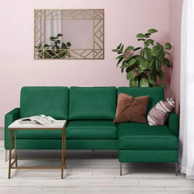 Ideal small space living room furniture. Modern L shaped sectional sofa designed with chrome legs and a soft velvet upholstery to lounge in complete comfort. Slender mailbox arms maximize seating space. Floating ottoman or chaise can be placed on either left or right side for added functionality. Minimal assembly required.