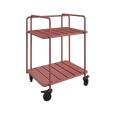 Perfect for playtime and fun hangs outside 4 sturdy wheels with smooth moves and 2 locking casters Weather-resistant powder coated steel in persimmon red finish with 2 slatted shelves Weight capacity of 50 lbs per shelf Outdoor carts dimension: 24" W x 19.3" D x 30.6". Shelf dimension: 23" W x 17" D