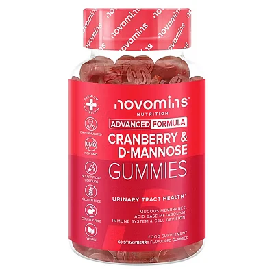 URINARY TRACT SUPPORT - Get the benefits of cranberry and D-Mannose in just two tasty gummies a day, with 600 mg of cranberry extract and 400 mg of dmannose. A simple, delicious alternative to cranberry juice, cranberry tablets, cranberry capsules, d mannose powder, or d mannose tablets - made to support your urinary health. BLADDER SUPPORT - Our carefully crafted cranberry supplements support bladder control and urinary tract health with just two d mannose and cranberry gummies. Designed to help flush out unwanted substances while supporting overall bladder balance. Compared to traditional bladder control tablets, our gummies are easier to take, gentler on the stomach, and quickly absorbed by the body. WHY CRANBERRY & D-MANNOSE? - Cranberry supplements are known for their natural ability to support urinary tract health, while D Mannose, a sugar naturally found in fruits like cranberries, plays a key role in supporting the body’s natural balance, particularly in the urinary tract. VEGAN & GLUTEN-FREE CRANBERRIES & D MANNOSE GUMMIES - Our cranberry & d mannose gummies are vegan-friendly, made with carefully sourced ingredients, and come in a delicious strawberry flavour. They’re free from artificial colours, flavourings, GMOs, and gluten. Plus, they include added zinc, inulin, and magnesium for extra support. WHY NOVOMINS? - Novomins offers premium-quality D-Mannose & Cranberry Gummies, setting a new standard in urinary tract health for both women and men. We’re committed to safety, ethical sourcing, and strict GMP manufacturing standards. Each bottle contains 60 gummies | One-month supply | 30 servings | Delicious strawberry flavour
