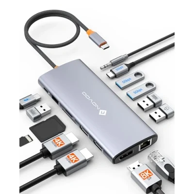 【Full Connectivity - NOVOO 14-IN-1】Unleash the full potential of your workspace with this 14-in-1 USB C docking station. Designed for the ultimate user experience, it combines high-speed data transfer, multi-monitor support, fast charging, and seamless audio connectivity into a sleek and powerful laptop dock. Turn your single IT port into a versatile gateway to efficiency and entertainment. 【8K Ultra High Definition Visual】USB C laptop docking station enhances your viewing experience with 1 DisplayPort 8K@30Hz and 2 HDMI ports 4K@60Hz. Designers, gamers and movie buffs will appreciate the stunning clarity and impeccable detail. It's not just a display; it's a window into a world of ultra-high-definition content. 【Multi Display – 3 Screen Display】Master your multitasking with STD support. Imagine effortlessly managing complex projects with spreadsheets, documents, and presentations spread across multiple displays, eliminating the need to press the Alt key on a single cluttered display. See an immersive gaming or cinematic experience with expanded views that immerse you in the action. MST isn't just about adding screens; it's about improving your efficiency, creativity and enjoyment in an unlimited way. 【Fast Data Transfer】Get ultra-fast sync with 5 x USB-A and 1 x USB-C with this docking station, each with a transfer rate of 5Gbps. Built-in SD/TF card readers, transferring photos, videos and data has never been easier. Perfect for busy professionals and tech enthusiasts, these USB C dock ports let you spend less time waiting and more time doing. 【PD 100W USB C Fast Charging】Keep your devices powered and ready with a robust 100W USB-C PD port. Quickly charge laptops, tablets and phones. 【Transparent Audio & Internet Connectivity】 The capabilities of our dual monitor docking station are complemented by its stable and high speed 1000Mbps Ethernet connection, and enjoy crystal clear sound thanks to the built-in 3.5mm audio and microphone jack. Whether you're streaming, downloading or participating in a conference call, your experience will be seamless and professional.