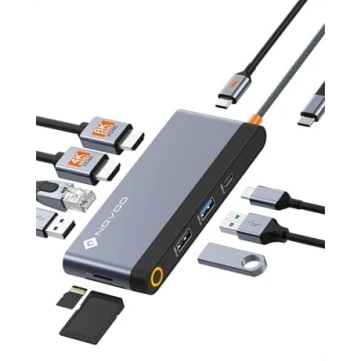 [10 Multi-function Port Docking Station] NOVOO docking station converts a USB-C port to 8K (30Hz) and 4K (60Hz) HDMI for synchronization with TVs, monitors and projectors. One USB-C port (5Gbps) and three USB-A ports (5Gbps/480Mbps) enable fast data transfers. One RJ45 LAN port supports 1000/100/10Mbps rates. SD and TF card readers allow mobile access to files. [8K UHD Display Experience] The 10-in-1 docking station integrates seamlessly with a variety of displays and projectors, supporting UHD outputs up to 8K (30Hz) and 4K (60Hz) for smooth, lag-free presentations and video playback. [Three Monitor Collaboration] Multi-monitor streaming (MST) support simplifies multitasking. Easily manage complex projects like spreadsheets, documents and presentations across multiple displays without having to hold down the Alt key on a single cluttered screen, dramatically improving your productivity. Enjoy wide viewing angles to play or watch movies at home, enriching your entertainment experience. [Ultra-fast Data Transfer] NOVOO USB-C to USB Adapter provides ultra-fast data transfer: 1 USB-C 3.0 + 1 USB-A 3.0 + 2 USB-A 2.0 (5Gbps for USB 3.0, 480Mbps for USB 2.0). This USB-C hub is compatible with internal SD cards and Micro SD cards, allowing fast and efficient transfer of photos, videos and data. [100W Fast & Powerful Charging] USB-C to PD Type-C port hub supports PD 3.0 protocol, allowing you to quickly charge your devices up to 87W of power (hub consumption: 13W), reducing charging times. But this PD Type-C port does not support data transmission, it is only for fast charging laptops, tablets and mobile phones.