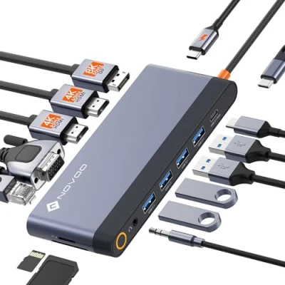 【Full Connectivity - NOVOO 14-IN-1】Unleash the full potential of your workspace with this 14-in-1 USB C docking station. Designed for the ultimate user experience, it combines high-speed data transfer, multi-monitor support, fast charging, and seamless audio connectivity into a sleek and powerful laptop dock. Turn your single IT port into a versatile gateway to efficiency and entertainment. 【8K Ultra High Definition Visual】USB C laptop docking station enhances your viewing experience with 1 DisplayPort 8K@30Hz and 2 HDMI ports 4K@60Hz. Designers, gamers and movie buffs will appreciate the stunning clarity and impeccable detail. It's not just a display; it's a window into a world of ultra-high-definition content. Plus, with VGA support, you can connect to a wider range of displays, ensuring nothing is forgotten. 【Multi Display - 4 Screen Display】Master your multitasking with STD support. Imagine effortlessly managing complex projects with spreadsheets, documents, and presentations spread across multiple displays, eliminating the need to press the Alt key on a single cluttered display. See an immersive gaming or cinematic experience with expanded views that immerse you in the action. MST isn't just about adding screens; it's about improving your efficiency, creativity and enjoyment in an unlimited way. 【Fast Data Transfer】Get ultra-fast sync with 4 x USB-A and 1 x USB-C with this docking station, each with a transfer rate of 5Gbps. Built-in SD/TF card readers, transferring photos, videos and data has never been easier. Perfect for busy professionals and tech enthusiasts, these USB C dock ports let you spend less time waiting and more time doing. 【PD 100W USB C Fast Charging】Keep your devices powered and ready with a robust 100W USB-C PD port. Quickly charge laptops, tablets and phones. 【Transparent Audio & Internet Connectivity】 The capabilities of our dual monitor docking station are complemented by its stable and high speed 1000Mbps Ethernet connection, and enjoy crystal clear sound thanks to the built-in 3.5mm audio and microphone jack. Whether you're streaming, downloading or participating in a conference call, your experience will be seamless and professional.