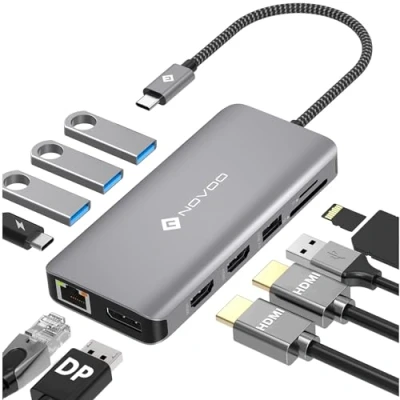 【Important Note】Before ordering this USB C dock, please make sure your laptop's USB-C port supports video output or DP alt mode, which decides whether HDMI ports and DP connection work or not. If you are unsure, please contact us 【Advanced Chip】Laptop docking station expands your working possibilities (supports 3 different monitors) and gives you more stable performance. With advanced smart chip, this USB-C docking station will be perfect for Dell/HP/Lenovo, no overload, over voltage, short circuit. Plug and play, no need to install drivers or software 【Ultra 4K Triple Display】 NOVOO USB C dock's display port helps you mirror or extend your laptop screen to 3 external monitors. HDMI resolution up to 4K@60Hz if your laptop supports DP1.4. When the input source only supports DP1.2, HDMI resolution up to 4K@30Hz. 2560x1440, 1920x1080 (1080P) and lower resolutions are displayed at 30Hz. For Apple laptops (MAC OS), only mirror mode is supported 【4 USB Ports & SD/TF Reader】 2 USB 3.0 ports with 5Gbps data transfer rate and 4.5W output power (5V/900mA). And 2 USB 2.0 ports are best used for your mouse, keyboard and other low-speed devices. Built-in SD and TF slot allows easy access to files from universal SD and micro SD memory cards with super speed up to 5Gbps 【100W PD Charging Port & Gigabit Ethernet】This USB C hub display port supports charging your laptop with up to 100W output when connecting multiple devices without worrying about power storage. The Dock for Dell gives you a stable high-speed Ethernet state, up to 1000Mbps, making your work more efficient.