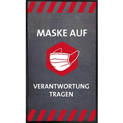 Direction sensor – cleaning power – warning: our information mats are 3 in 1 and make the applicable mask obligation clearly visible in trade, practice and public institutions The floor mats are suitable for retail, pharmacies, bakeries, butchers, government, post office, banks and anywhere queues can form Doormat in long format 85 x 150 cm with a pile height of approx. 6mm (Total Height 7-8mm) Step width: approx. 20 mm. The mats are washable at max. 30 °C Back with nitrile rubber coating, thickness approx. 1.4mm This prevents the dirt trapper mat from slipping. Accidents are avoided and the mat stays in place The practical rug alerts your customers to wear the mouth guard and placed in the entrance area, it serves as a dirt trap