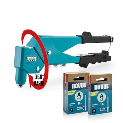 Precise 360° technology – universal blind rivet pliers with unique 360° swivel head for precise work even in hard-to-reach places. Ideal for demanding DIY projects and professional workshops. Maximum versatility – uses blind rivets made of various materials (aluminium, steel and more) up to a diameter of 4.8 mm. The narrow precision head allows precise work even in tight areas. Robust premium construction – durable device body made of high-quality aluminium combined with a sturdy lever made of sheet steel for long-lasting reliability. Comfortable work – the easy one-hand operation thanks to the integrated return spring, the independent mandrel ejection and the ergonomic handle design ensure fatigue-free work even on extensive projects. Sophisticated details – handle lock for safe storage and patented gauge in the handle for direct measurement of rivet strength. Includes integrated mounting key for quick mouthpiece change and 4 interchangeable mouthpieces conveniently stored on the device. Complete starter set – includes 100 aluminium blind rivets in different sizes for an immediate start of work., Weight: 1.4660740423 Pounds, Manufacturer: Novus