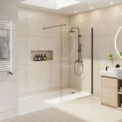 General description Wet Room Shower Enclosure Screen Panel designed for modern bathrooms, featuring a sleek matte black framed design. This product combines functionality with style, providing a spacious and elegant solution for your wet room. Technical specifications Product Size: 1400mm (W) x 1950mm (H) Glass Thickness: 8mm clear self-cleaning glass Frame Material: Matte black flat aluminum Support Bar: 1M stainless steel adjustable support bar (can be cut to size) Adjustable Distance: 15mm for out of true wall Installation Easy to install with included installation and fixing materials Can be fitted for left or right-hand entry