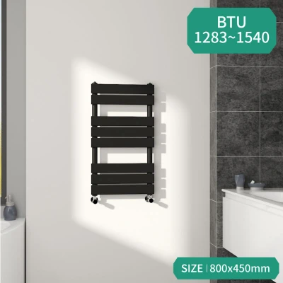 General description Compared with normal heated towel rails, the Flat Panel Rail has a larger surface area to provide higher heat output. This model easily fits into all standard central heating systems without complicated installation. Technical specifications Material: Low Carbon Steel Size: 800x450 mm (Height x Width) Bars: 8 Water inlet/outlet size: 4-G1/2" Powder coated finish tested to exceed 200 hours of neutral acid salt spray testing Tested to BS EN442 standards Complies with ISO9001:2008 regulations Compatibility and accessories Compatible for use on all UK heating systems (tank fed or combi systems) No valves included Other information All rails come with a 15-year warranty (applicable exclusively for water leakage claims within the warranty period)