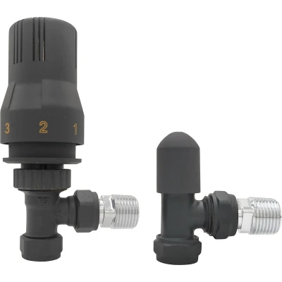 General description These are top-of-the-range industry standard angled thermostatic radiator valves, ideal for most domestic radiators. They feature a modern design and a stylish anthracite finish. Technical specifications Thermostatic Control Connections: 15mm inlet, 1/2" BSP MI outlet Built-in sensor with liquid-filled element Industry standard - 15mm connection Compatibility and accessories Pack Includes: 1 x 15mm Angled Thermostatic Radiator Valve 1 x 15mm Angled Manual Valve