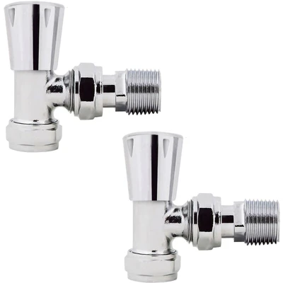 General description These angled radiator valves are perfect for controlling the heat output of your towel rail and are ideal for most domestic radiators. They feature a modern design and a high-quality chrome finish, making them both functional and stylish. Technical specifications Connections: 15mm inlet, 1/2" BSP MI outlet Industry standard: 15mm connection Other information Pack includes: 2 x 15mm Angled Manual Valve