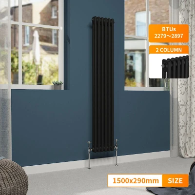 General description Our NRG Traditional Vintage Cast Iron Style Radiator offers a heating solution that combines a classic design with modern functionality at a competitive price. Specially tested, this radiator helps you maximize your available space while seamlessly fitting into your central heating system like a standard household radiator, ensuring a straightforward installation process. Technical specifications Material: 1.5mm Cast Iron style SPCC Steel Size: 1500 x 290 mm Panel: Double Column Water inlet/outlet size: 1/2" Finish: Black High heat output Tested to BS EN442 standards Other information Brackets and fixings included (valves not included) 15-year guarantee