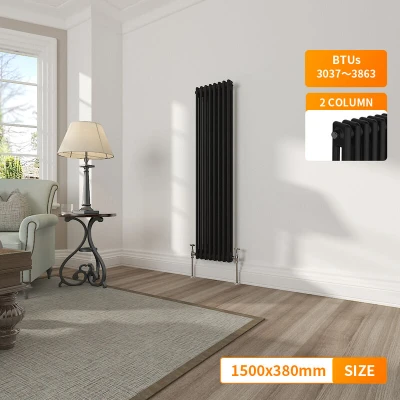 General description Our NRG Traditional Vintage Cast Iron Style Radiator offers a heating solution that combines a classic design with modern efficiency. This radiator is designed to fit seamlessly into your central heating system, ensuring straightforward installation without complications. Each unit has been rigorously tested to maximize your available space while providing high heat output. Technical specifications Material: 1.5mm Cast Iron style SPCC Steel Size: 1500 x 380 mm Panel: Double Column Water inlet/outlet size: 1/2" Finish: Black Tested to BS EN442 standards Other information Durable high-quality black finish Brackets and fixings included (valves not included) 15-year guarantee