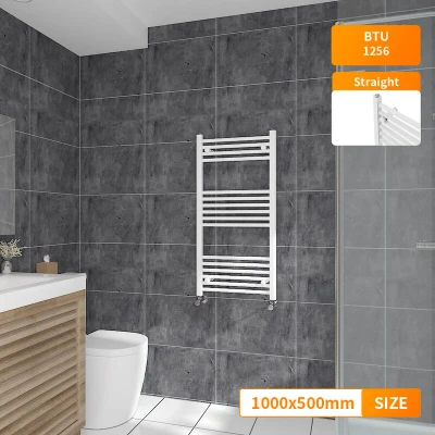 General description This Bathroom Heated Towel Rail Radiator features a contemporary style that fits any kind of interior design. Its modern manufactured finish process ensures a smooth and elegant appearance, making it a stylish addition to your bathroom. Technical specifications Material: Low carbon steel Model: Straight in White Size: 1000x500mm Inlets and outlets: 1/2" Certification: Powder coated finish exceeding 200 hours of neutral acid salt spray testing Tested to BS & EN442 Complies with ISO9001:2008 regulations Complies with UKCA regulations Compatibility and accessories Compatible for use on all UK heating systems (tank fed or combi systems) Valves are not included Other information Tested under high hydraulic pressure to ensure impermeability Manufacturer-leading 15-year warranty applicable exclusively for water leakage claims within the warranty period