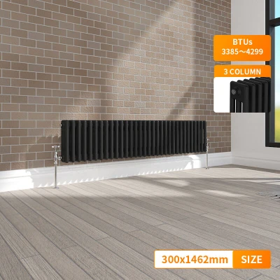 General description Our NRG Traditional Vintage Cast Iron Style Radiator offers a heating solution that combines a classic design with modern functionality at a competitive price. Specially tested, this radiator helps you maximize your available space while easily integrating into your central heating system without complicated installation. Technical specifications Material: 1.5mm Cast Iron style SPCC Steel Size: 300 x 1462 mm Panel: Triple Column Water inlet/outlet size: 1/2" Finish: Black Tested to BS EN442 standards Other information Durable high-quality black finish High heat output Brackets and fixings included (valves not included) 15-year guarantee