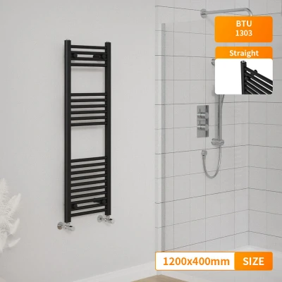 General description Contemporary style, fits any kind of interior design. The modern manufactured finish process gives the radiator a smooth and elegant appearance. Technical specifications Material: low carbon steel Model: Straight in Black Size: 1200x400mm Inlets and outlets: 1/2" Tested to BS & EN442 Certification: Powder coated finish to exceed 200 hours of neutral acid salt spray testing Complies with ISO9001:2008 regulations Complies with UKCA regulations Compatibility and accessories Compatible for use on all UK heating systems (tank fed or combi systems) Valves are not included Other information Tested under high hydraulic pressure to ensure impermeability All radiators come with a manufacturer-leading 15-year warranty (applicable exclusively for water leakage claims within the warranty period)