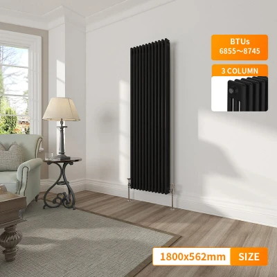 General description Our NRG Traditional Vintage Cast Iron Style Radiator offers a heating solution with a classic design at a competitive price. Specially tested, it helps you maximize your available space while easily fitting into your central heating system like a standard household radiator, ensuring a straightforward installation process. Technical specifications Material: 1.5mm Cast Iron style SPCC Steel Size: 1800 x 562 mm Panel: Triple Column Water inlet/outlet size: 1/2" Finish: Black High heat output Tested to BS EN442 standards Other information Brackets and fixings included (valves not included) 15-year guarantee