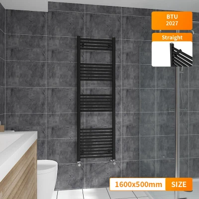 General description Modern Bathroom 1600 x 500mm Heated Towel Rail Radiator in a sleek black finish, designed to complement any contemporary interior. Its smooth and elegant appearance is achieved through a modern manufacturing process. Technical specifications Material: Low carbon steel Model: Straight in Black Size: 1600 x 500 mm Inlets and outlets: 1/2" Certification: Powder coated finish exceeding 200 hours of neutral acid salt spray testing Tested to BS & EN442 standards Complies with ISO9001:2008 regulations Complies with UKCA regulations Compatibility and accessories Compatible with all UK heating systems (tank fed or combi systems) Valves are not included Other information Tested under high hydraulic pressure to ensure impermeability Manufacturer-leading 15-year warranty applicable exclusively for water leakage claims within the warranty period