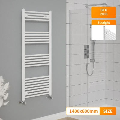 General description Modern Bathroom Heated Towel Rail Radiator in a sleek straight design, measuring 1400 x 600mm. This contemporary radiator is designed to fit seamlessly into any interior decor, providing both functionality and style. Technical specifications Material: Low carbon steel Size: 1400 x 600mm Inlets and outlets: 1/2" Finish: Powder coated, tested to exceed 200 hours of neutral acid salt spray testing Tested to BS & EN442 standards Complies with ISO9001:2008 regulations Complies with UKCA regulations Compatibility and accessories Compatible with all UK heating systems (tank fed or combi systems) Valves are not included Other information Tested under high hydraulic pressure to ensure impermeability Manufacturer-leading 15-year warranty applicable exclusively for water leakage claims within the warranty period