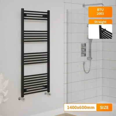 General description Modern Bathroom 1400 x 600mm Heated Towel Rail Radiator in Straight Black features a contemporary style that fits any kind of interior design. The modern manufacturing finish process gives the radiator a smooth and elegant appearance. Technical specifications Material: Low carbon steel Model: Straight in Black Size: 1400 x 600 mm Inlets and outlets: 1/2" Certification: Powder coated finish exceeding 200 hours of neutral acid salt spray testing Tested to BS & EN442 Complies with ISO9001:2008 regulations Complies with UKCA regulations Compatibility and accessories Compatible for use on all UK heating systems (tank fed or combi systems) Valves are not included Other information Tested under high hydraulic pressure to ensure impermeability Manufacturer-leading 15-year warranty applicable exclusively for water leakage claims within the warranty period