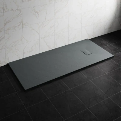 Features: Durable Construction: SMC materials are known for their strength and resilience, making the shower tray highly durable and long-lasting. Elegant Appearance: The stone pattern provides a sophisticated look, adding a touch of luxury to any bathroom setting. Non-Slip Surface: Designed for safety, the textured finish helps prevent slipping, ensuring a safer showering experience. Lightweight Design: Despite its robust make, an SMC shower tray is lightweight, making installation easier and more manageable. Easy to Clean: The smooth, non-porous surface prevents the accumulation of grime and is easy to maintain, enhancing hygiene. Eco-Friendly: SMC materials can be produced using environmentally friendly processes, making it a sustainable choice for conscious consumers. Specification: -Tray Type: Rectangle -Colour: Anthracite -Material: SMC -Non-Slip surface -Height: 32mm -Length: 1800mm -Width: 800mm -Waste Hole Size: 90mm -Waste Location: Side of Tray -Drain Cover Size: 20x12cm