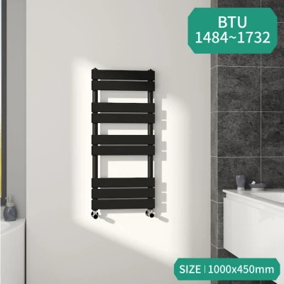 General description Compared with normal heated towel rails, the Flat Panel Rail has a larger surface area to provide higher heat output. It easily fits into all standard central heating systems without complicated installation. Technical specifications Material: Low Carbon Steel Size: 1000x450 mm (HxW) Bars: 9 Water inlet/outlet size: 4-G1/2" Powder coated finish to exceed 200 hours of neutral acid salt spray testing Compatibility and accessories Compatible for use on all UK heating systems (tank fed or combi systems) No valves included Other information Tested to BS EN442 standards Complies with ISO9001:2008 regulations 15-year warranty applicable exclusively for water leakage claims within the warranty period