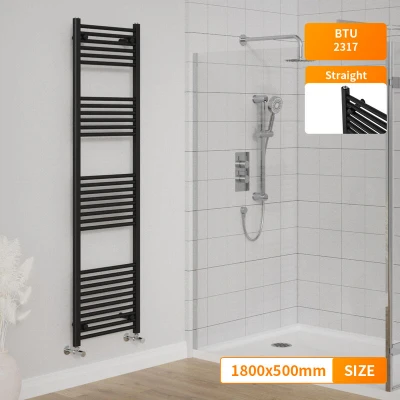 General description Modern Bathroom 1800 x 500mm Heated Towel Rail Radiator in a sleek black finish features a contemporary style that fits any kind of interior design. The modern manufacturing process ensures a smooth and elegant appearance, making it a stylish addition to your bathroom. Technical specifications Material: Low carbon steel Model: Straight in Black Size: 1800 x 500 mm Inlets and outlets: 1/2" Certification: Powder coated finish exceeding 200 hours of neutral acid salt spray testing Tested to BS & EN442 Complies with ISO9001:2008 regulations Complies with UKCA regulations Compatibility and accessories Compatible for use on all UK heating systems (tank fed or combi systems) Valves are not included Other information Tested under high hydraulic pressure to ensure impermeability Manufacturer-leading 15-year warranty applicable exclusively for water leakage claims within the warranty period