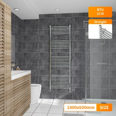 General description Modern Towel Rail Radiator in Chrome features a contemporary style that fits any kind of interior design. Its modern manufactured finish process ensures a smooth and elegant appearance. Technical specifications Material: Low carbon steel Model: Straight in Chrome Size: 1800 x 600 mm Inlets and outlets: 1/2" Certification: Powder coated finish exceeding 200 hours of neutral acid salt spray testing Tested to BS & EN442 Complies with ISO9001:2008 regulations Complies with UKCA regulations Compatibility and accessories Compatible for use on all UK heating systems (tank fed or combi systems) Valves are not included Other information Tested under high hydraulic pressure to ensure impermeability Manufacturer-leading 15-year warranty applicable exclusively for water leakage claims within the warranty period