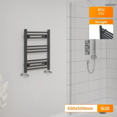 General description Contemporary style that fits any kind of interior design. The modern manufactured finish process gives the radiator a smooth and elegant appearance. Technical specifications Material: Low carbon steel Model: Straight in Anthracite Size: 600 x 500 mm Inlets and outlets: 1/2" Tested to BS & EN442 Certification: Powder coated finish exceeding 200 hours of neutral acid salt spray testing Complies with ISO9001:2008 regulations Complies with UKCA regulations Compatibility and accessories Compatible for use on all UK heating systems (tank fed or combi systems) Valves are not included Other information Tested under high hydraulic pressure to ensure impermeability Manufacturer-leading 15-year warranty applicable exclusively for water leakage claims within the warranty period