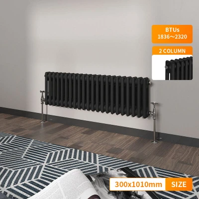 General description Our NRG Traditional Vintage Cast Iron Style Radiator offers a heating solution that combines a classic design with modern efficiency at a competitive price. Specially tested, this radiator helps you maximize your available space while easily integrating into your central heating system without complicated installation. Technical specifications Material: 1.5mm Premium Mild Steel Size: 300 x 1010 mm Panel: Double Column Water inlet/outlet size: 1/2" Finish: Black High heat output Tested to BS EN442 standards Other information Brackets and fixings included (valves not included) 15-year guarantee