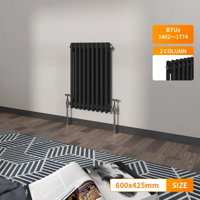 General description Our NRG Traditional Vintage Cast Iron Style Radiator offers a heating solution with a classic design at a competitive price. Specially tested, it helps you maximize your available space while easily fitting into your central heating system like a standard household radiator, ensuring a straightforward installation. Technical specifications Material: 1.5mm Cast Iron style SPCC Steel Size: 600 x 425 mm Panel: Double Column Water inlet/outlet size: 1/2" Finish: Black High heat output Tested to BS EN442 standards Other information Brackets and fixings included (valves not included) 15-year guarantee