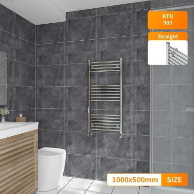 General description Contemporary style, suitable for any kind of interior design. The modern manufacturing finish process gives the radiator a smooth and elegant appearance. Technical specifications Material: Low carbon steel Model: Straight in Chrome Size: 1000x500mm Inlets and outlets: 1/2" Tested to BS & EN442 Certification: Powder coated finish exceeding 200 hours of neutral acid salt spray testing Complies with ISO9001:2008 regulations Complies with UKCA regulations Compatibility and accessories Compatible for use on all UK heating systems (tank fed or combi systems) Valves are not included Other information Tested under high hydraulic pressure to ensure impermeability Manufacturer-leading 15-year warranty applicable exclusively for water leakage claims within the warranty period