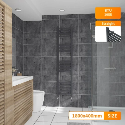 General description Contemporary style that fits any kind of interior design. The modern manufacturing finish process gives the radiator a smooth and elegant appearance. Technical specifications Material: Low carbon steel Model: Straight in Anthracite Size: 1800 x 400 mm Inlets and outlets: 1/2" Tested to BS & EN442 Certification: Powder coated finish exceeding 200 hours of neutral acid salt spray testing Complies with ISO9001:2008 regulations Complies with UKCA regulations Compatibility and accessories Compatible for use on all UK heating systems (tank fed or combi systems) Valves are not included Installation Tested under high hydraulic pressure to ensure impermeability Other information All radiators come with a manufacturer-leading 15-year warranty (applicable exclusively for water leakage claims within the warranty period)