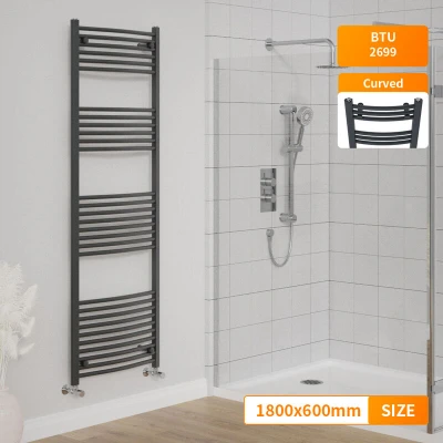 General description Modern Towel Rail Radiator in Anthracite features a contemporary style that fits any kind of interior design. Its modern manufacturing process ensures a smooth and elegant finish, making it a stylish addition to your bathroom. Technical specifications Material: Low carbon steel Model: Curved Size: 1800 x 600 mm Inlets and outlets: 1/2" Finish: Powder coated, tested to exceed 200 hours of neutral acid salt spray testing Tested to BS & EN442 Complies with ISO9001:2008 regulations Complies with UKCA regulations Compatibility and accessories Compatible with all UK heating systems (tank fed or combi systems) Valves are not included Other information Tested under high hydraulic pressure to ensure impermeability Manufacturer-leading 15-year warranty applicable exclusively for water leakage claims within the warranty period