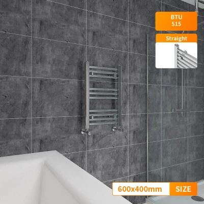 General description This Bathroom Straight Chrome Heated Towel Rail Radiator features a contemporary style that fits any kind of interior design. Its modern manufactured finish process ensures a smooth and elegant appearance. Technical specifications Material: Low carbon steel Model: Straight in Chrome Size: 600 x 400 mm Inlets and outlets: 1/2" Tested to BS & EN442 Certification: Powder coated finish exceeding 200 hours of neutral acid salt spray testing Complies with ISO9001:2008 regulations Complies with UKCA regulations Compatibility and accessories Compatible for use on all UK heating systems (tank fed or combi systems) Valves are not included Other information Tested under high hydraulic pressure to ensure impermeability Manufacturer-leading 15-year warranty applicable exclusively for water leakage claims within the warranty period