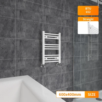 General description Contemporary style that fits any kind of interior design. The modern manufactured finish process gives the radiator a smooth and elegant appearance. This heated towel rail is designed for use on all UK heating systems, including tank-fed and combi systems. Technical specifications Material: Low carbon steel Model: Straight in White Size: 600 x 400 mm Inlets and outlets: 1/2" Powder coated finish tested to exceed 200 hours of neutral acid salt spray testing Tested to BS & EN442 Complies with ISO9001:2008 regulations Complies with UKCA regulations Other information Tested under high hydraulic pressure to ensure impermeability Manufacturer-leading 15-year warranty applicable exclusively for water leakage claims within the warranty period Valves are not included